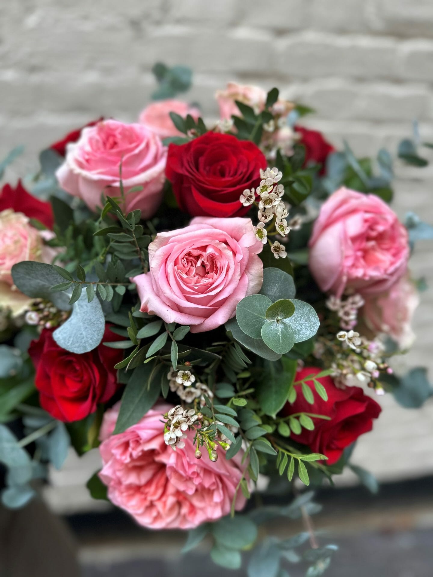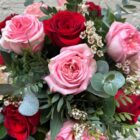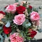 A beautifully romantic Valentine’s bouquet featuring blush pink and classic red roses, delicately accented with seasonal blooms and soft eucalyptus foliage.