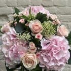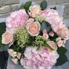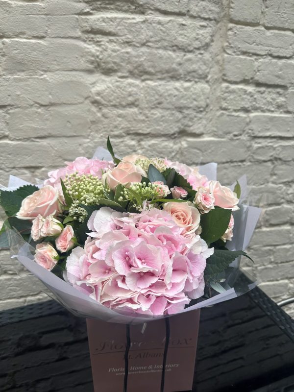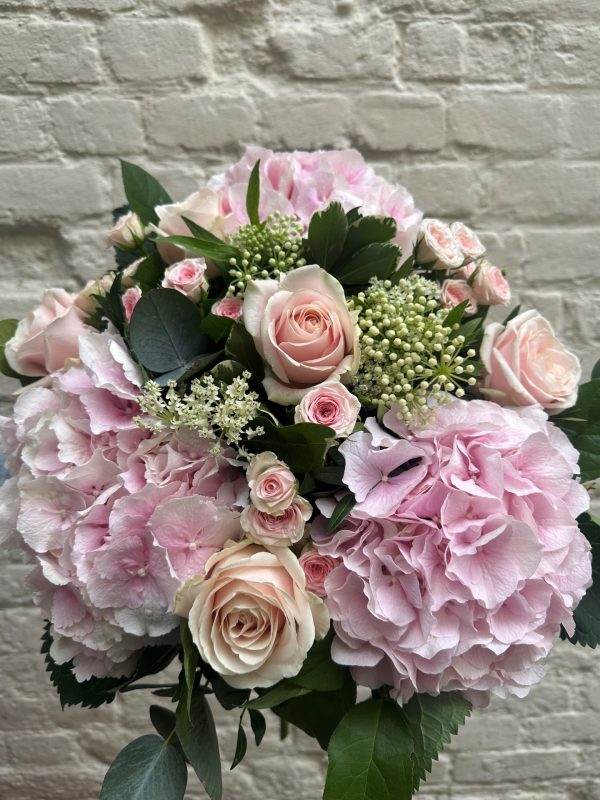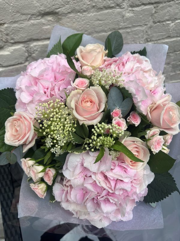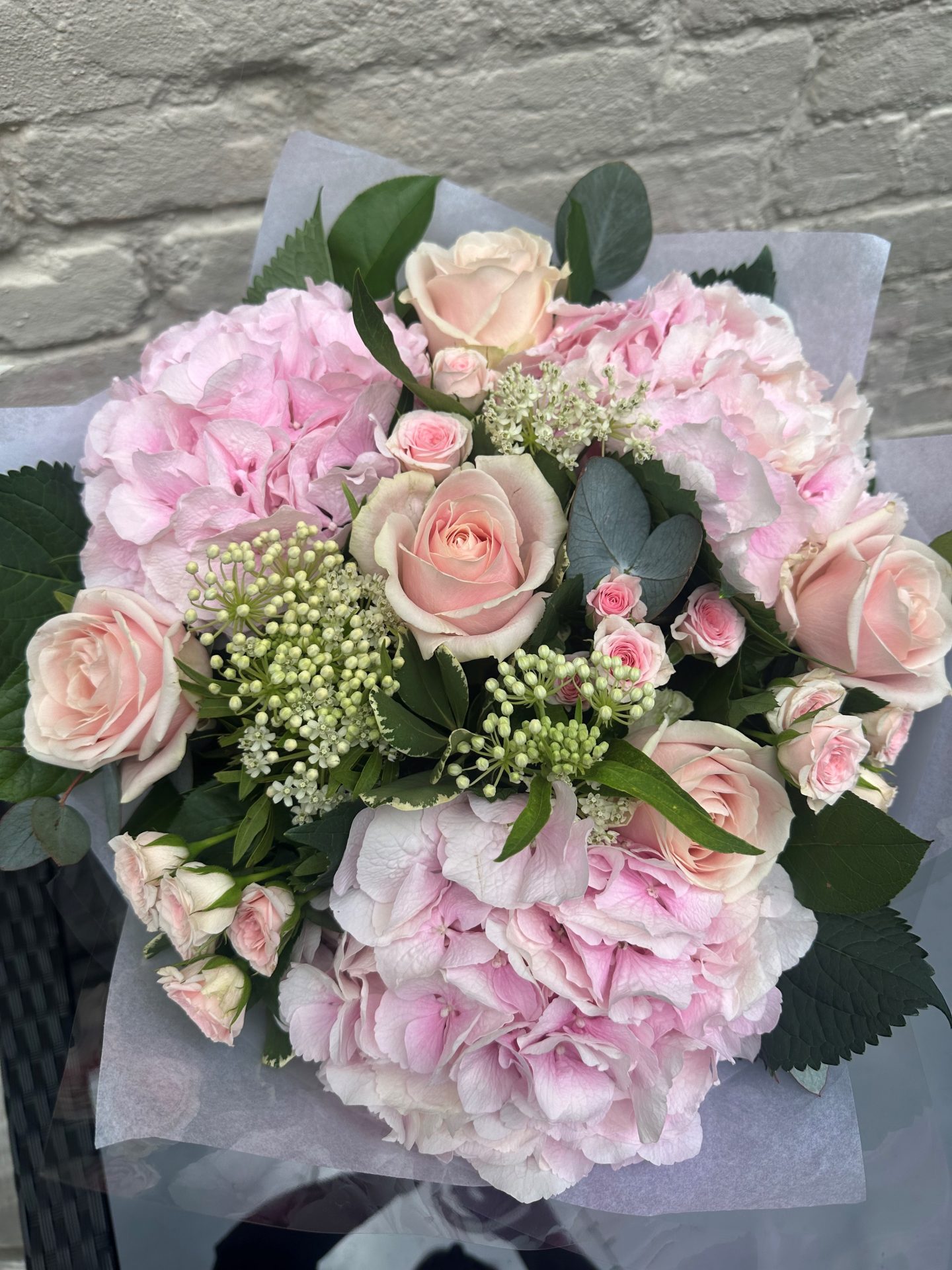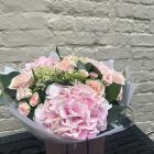The most beautiful selection of Pink Hydrangeas, Pink Roses, Spray Roses, Asclepias and Foliage framed beautifully in one of our bouquet bags. Perfect for any Occasion.