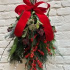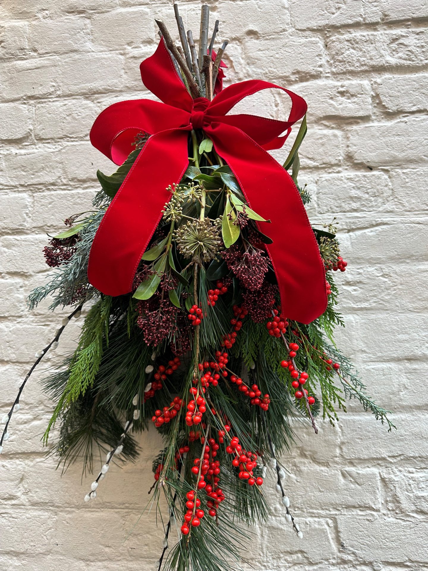A beautifully handcrafted Christmas swag made with fresh seasonal foliage, arranged by hand for a natural, festive look. Finished with a soft velvet ribbon.