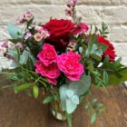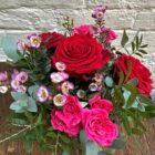 A charming Valentine’s arrangement featuring rich red roses and vibrant pink spray roses, accented with delicate seasonal flowers and fresh greenery.