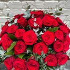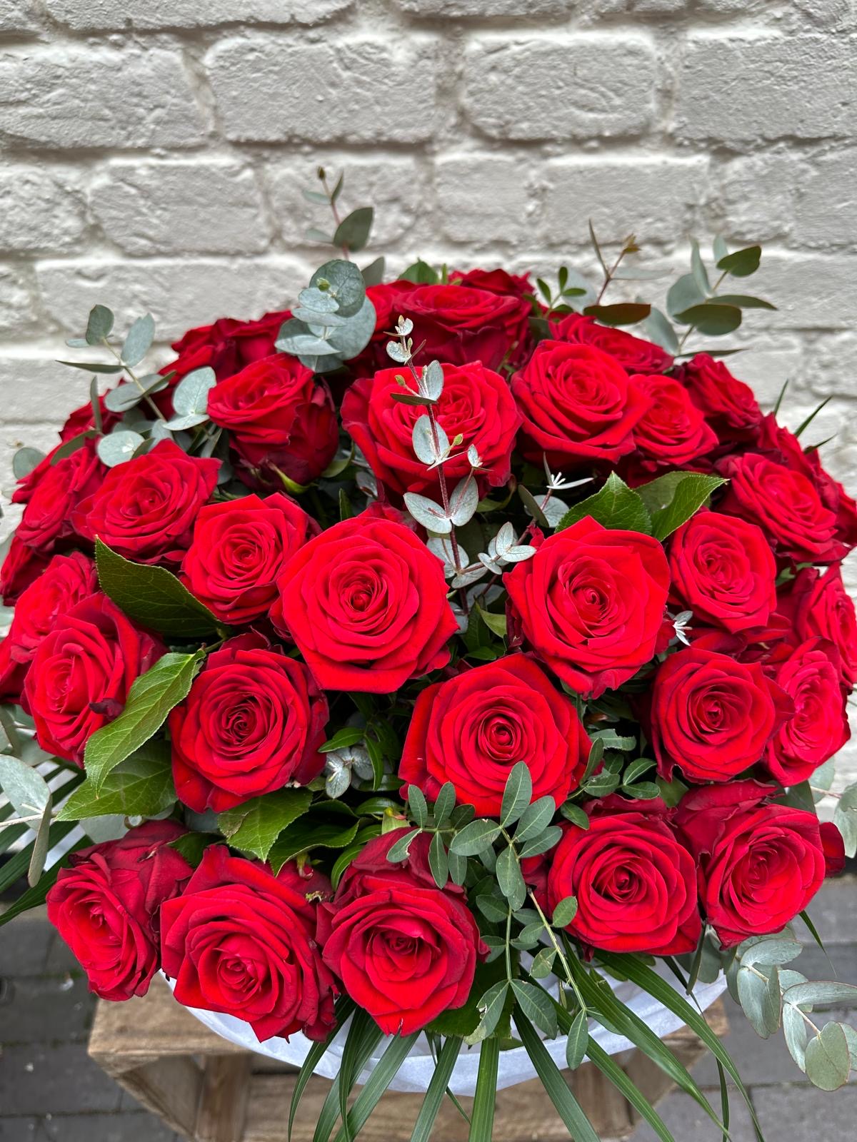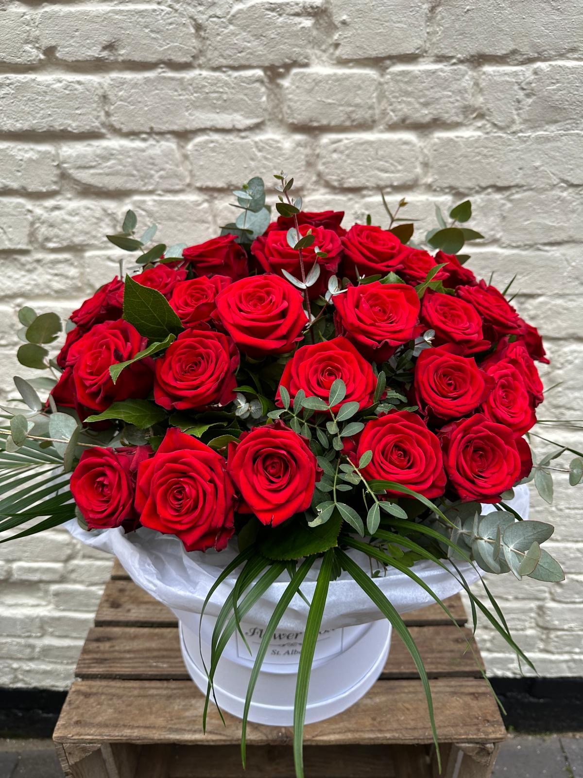 Beautiful selection of Red Roses with foliage arranged in our Personalized Hat Box.