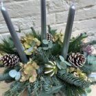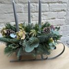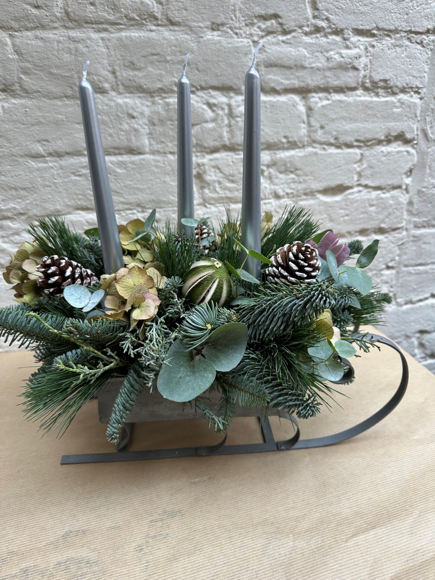 Bring a touch of winter magic to your home with this charming festive arrangement, beautifully displayed in a metal sleigh. Filled with fresh seasonal foliage, eucalyptus, hydrangea, pine cones and elegant decorative touches, it creates the perfect cosy centrepiece. Finished with three classic taper candles, it’s ideal for Christmas tables, sideboards, or as a unique gift to brighten the season.