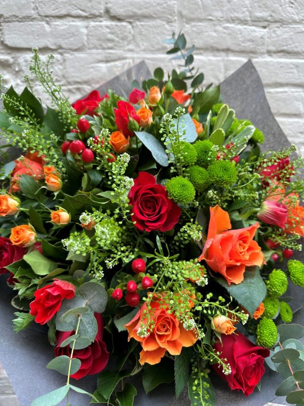 Beautiful selection of Red Roses, Orange Roses, spray Roses, hypericum arranged in an aqua pack with mixed foliages.