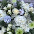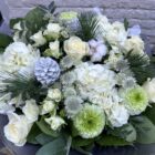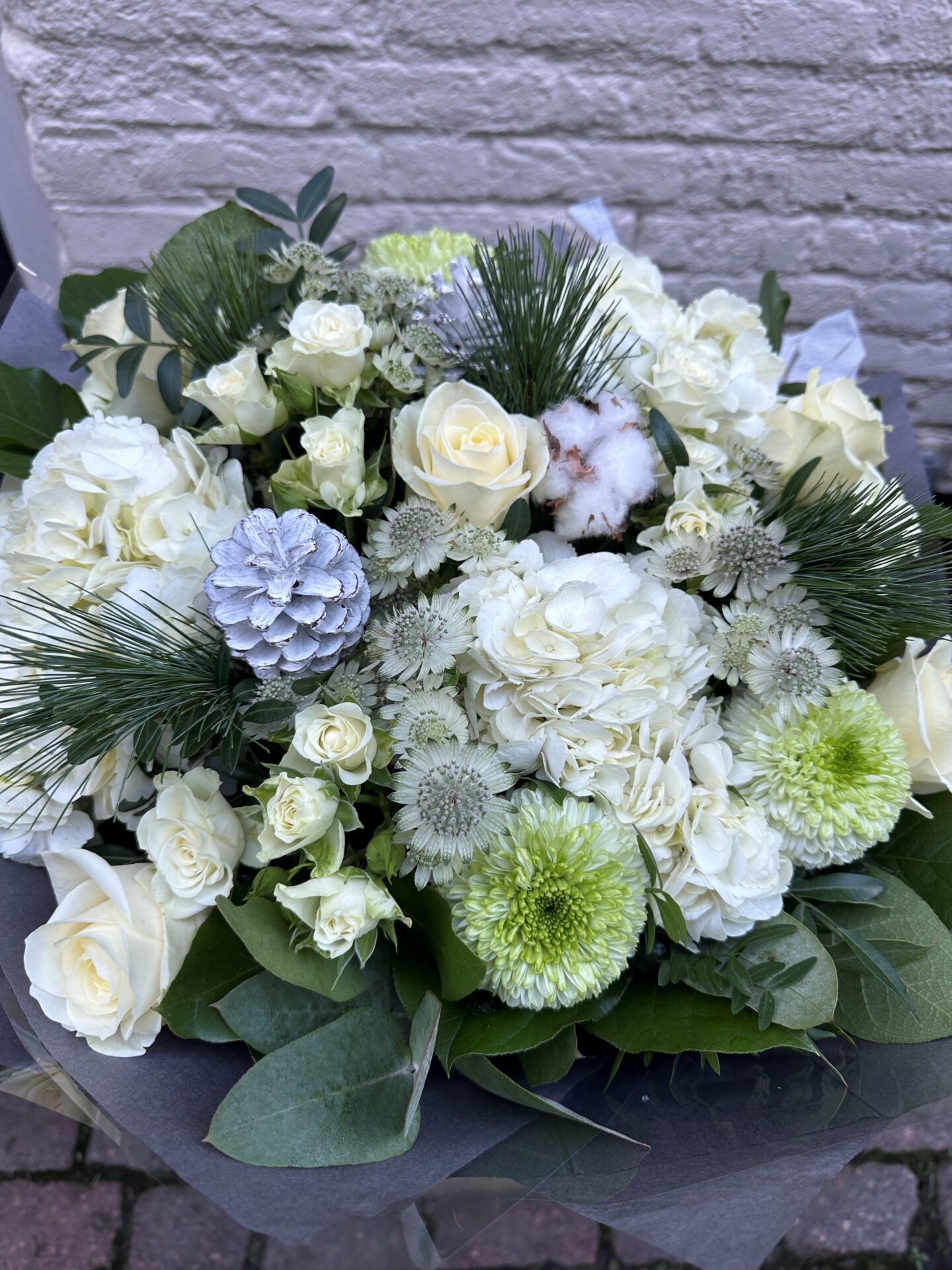 Beautiful selection of white roses, berries, hydrangea and Christmas foliage’s framed in our bouquet bag.